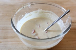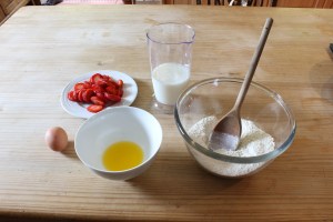 In a large bowl (or medium, if you are staying in a cottage which only has one bowl available and this bowl happens to be medium-sized), mix together the flour and baking powder (and maybe a pinch of salt if you’re using unsalted butter). Create a well in the middle of the flour mixture. Beat together the egg and milk, and then pour this into the well. Whisk with a funny shaped whisk (or, you know, a normal one. You can even use an electric whisk if you’re fancy.) until you have a smooth, thick batter. Beat in the butter and then gently stir in the strawberries.
