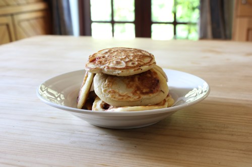 Heat a small amount of oil or butter in a large non-stick frying pan and drop one big tablespoon of the mixture per pancake into the pan to create pancakes which are about 7.5cm across. I thought mine were about this size but maybe they weren’t and that’s why I had 20. Anyway, make three or four pancakes at a time, otherwise they all run together and you end up with a big pancake (is this a bad thing?). Cook for about 3 minutes, until bubbles appear in the surface of the pancake, and then flip over and cook for another 2-3 minutes until golden. Keep these warm while you make more.