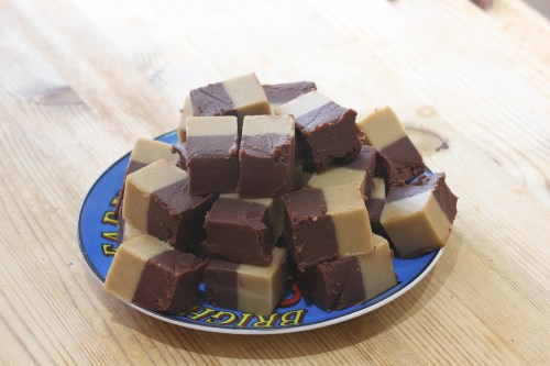 Using an electric whisk. beat the mixture for 8-10 minutes, until it thickens. Pour into the oiled tin and transfer to the fridge to set. The recipe says leave for 5 hours, but I just left it in the fridge for an hour while I made the butterscotch fudge, then poured the butterscotch on top of the chocolate and then put the tin back in the fridge for 5 hours.