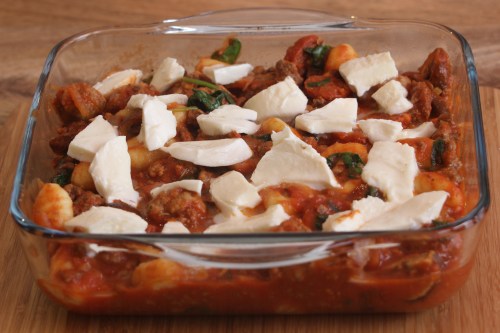 Once the gnocchi is cooked, drain it and toss it with the sauce. Transfer to an ovenproof dish and top with the mozzarella. Bake for 10-15 minutes. Serve!