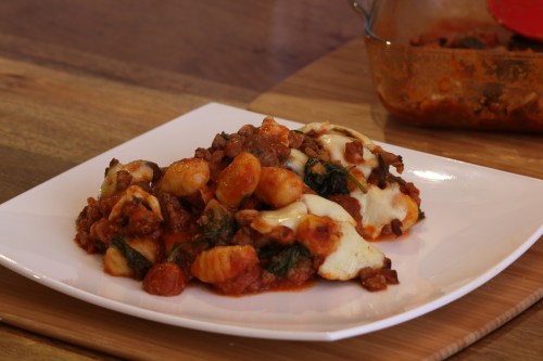Often with this type of recipe, I wonder whether to eat it as soon as the sauce and pasta or gnocchi are cooked, or whether to toss them together, smother in cheese and bake in the oven. This usually depends on whether how hungry I am (very) outweighs how much I want my tea to be smothered in melted mozzarella (a lot). This time, cheese won, but if you’re hungry then you can skip that step!