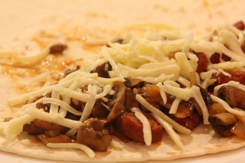 Lightly brush one side of each tortilla wrap with oil. Put the wraps oil-side down on a plate and cover half of each wrap with the mushrooms, shallots and chorizo. Sprinkle 20g cheese on each wrap and fold them in half. Press down to help them stay folded.