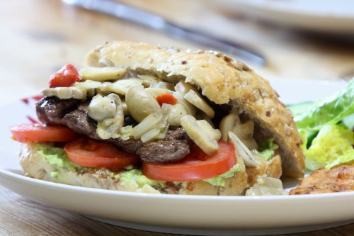 Let the steaks rest for a few minutes. Split the bread, spread with avocado, top with tomatoes, steak and mushrooms. Yum yum yum.